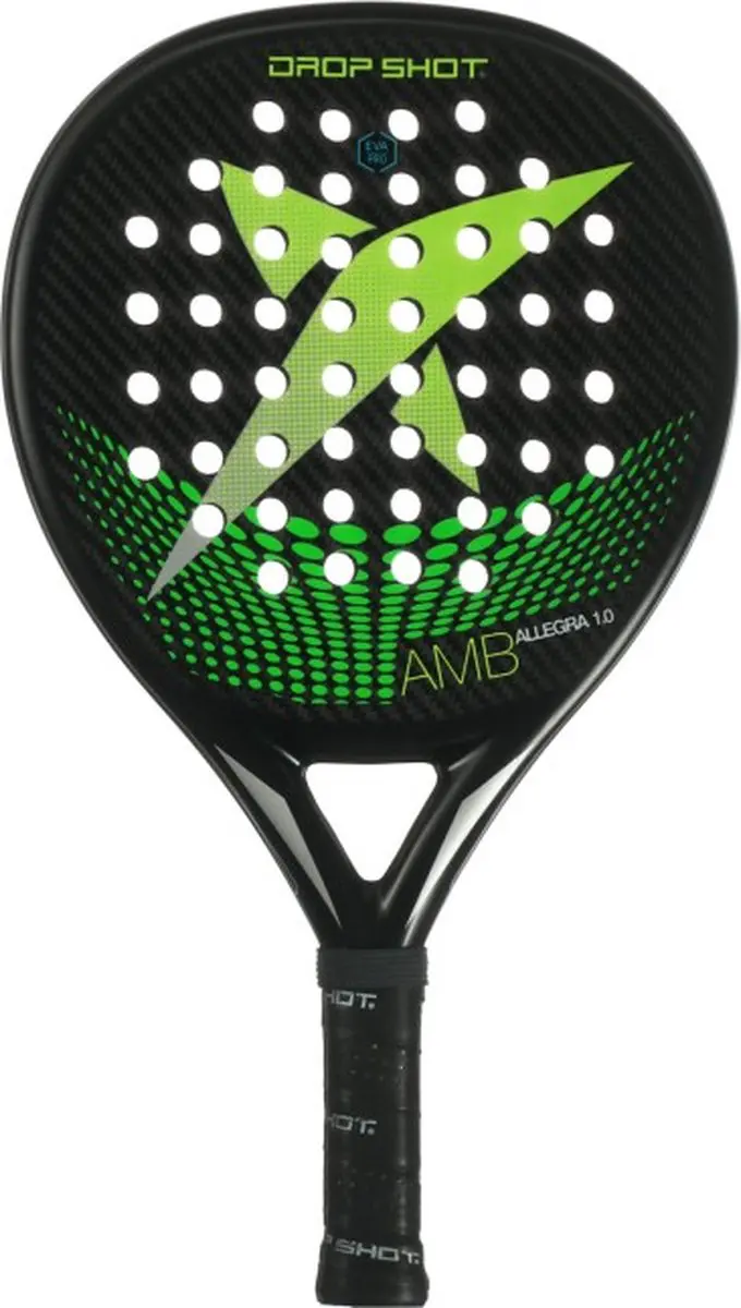 Drop Shot Allegra 1.0 Padelracket De Drop Shot Allegra 1.0 is een padelracket uit de Ambition lijn, deze padelrackets bieden maximaal comfort en veelzijdigheid voor gevorderde spelers die hun spel willen verbeteren. Dit racket biedt je 50% power en 50% controle. De rackets in de Ambition lijn zijn ideaal voor als je op zoek bent naar naar de perfecte balans tussen controle en power, waarbij je je op je gemak voelt. De Ambition padelracket lijn is uitgerust met CARBON 3000. CARBON 3000 is samengesteld uit 2 types carbon. Het comfort in deze padelrackets ontstaat door ze uit te voeren met 3 verschillende soorten EVA. EVA SOFT, EVA PRO en EVA TECH. De CORK LAYER-technologie in het blad vermindert trillingen en geeft extra power. Dit alles maakt deze lijn de meest veelzijdige en uitgebalanceerde in de padelracket collectie, waar je het type racket kunt vinden dat het beste bij jouw spel past.