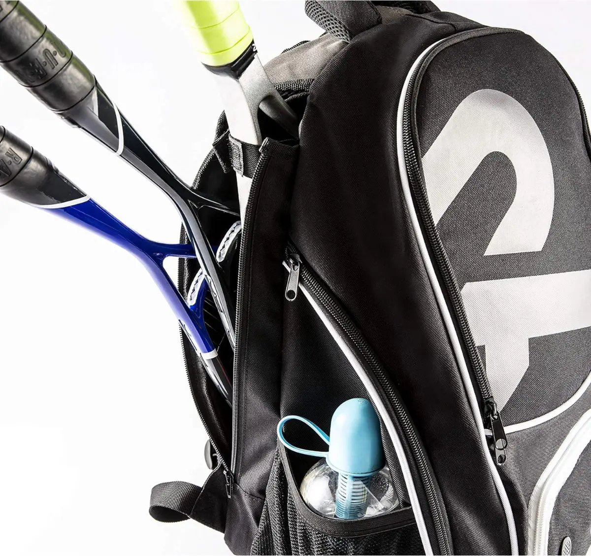 Een veelzijdige sportrugzak met een apart vak voor een racket, geschikt voor 1 tennisracket of 2 badminton- of squashrackets, met een klittenbandriem om de rackets vast te zetten. Het hoofdcompartiment met ritssluiting heeft een laptopvak of ruimte voor documenten met klittenbandsluiting, een kleine zak voor mobiele telefoon (groot genoeg voor een iPhone 11), met een ritsvak aan de voorkant voor portemonnee en sleutels, 3 penlussen en ruimte voor andere items. Het (sport)schoenenvak heeft ventilatie, zodat je schoenen niet in contact komen met andere items. Twee zijvakken met ritssluiting, plus twee extra zijvakken met elastische band, ideaal voor flessen. De rugzak heeft een voering aan de achterkant en op de schouderbanden voor optimaal comfort, zelfs met veel gewicht. De verstelbare schouderbanden kunnen worden vastgezet met een snelsluiting, zodat de rugzak perfect op zijn plaats blijft tijdens het dragen.